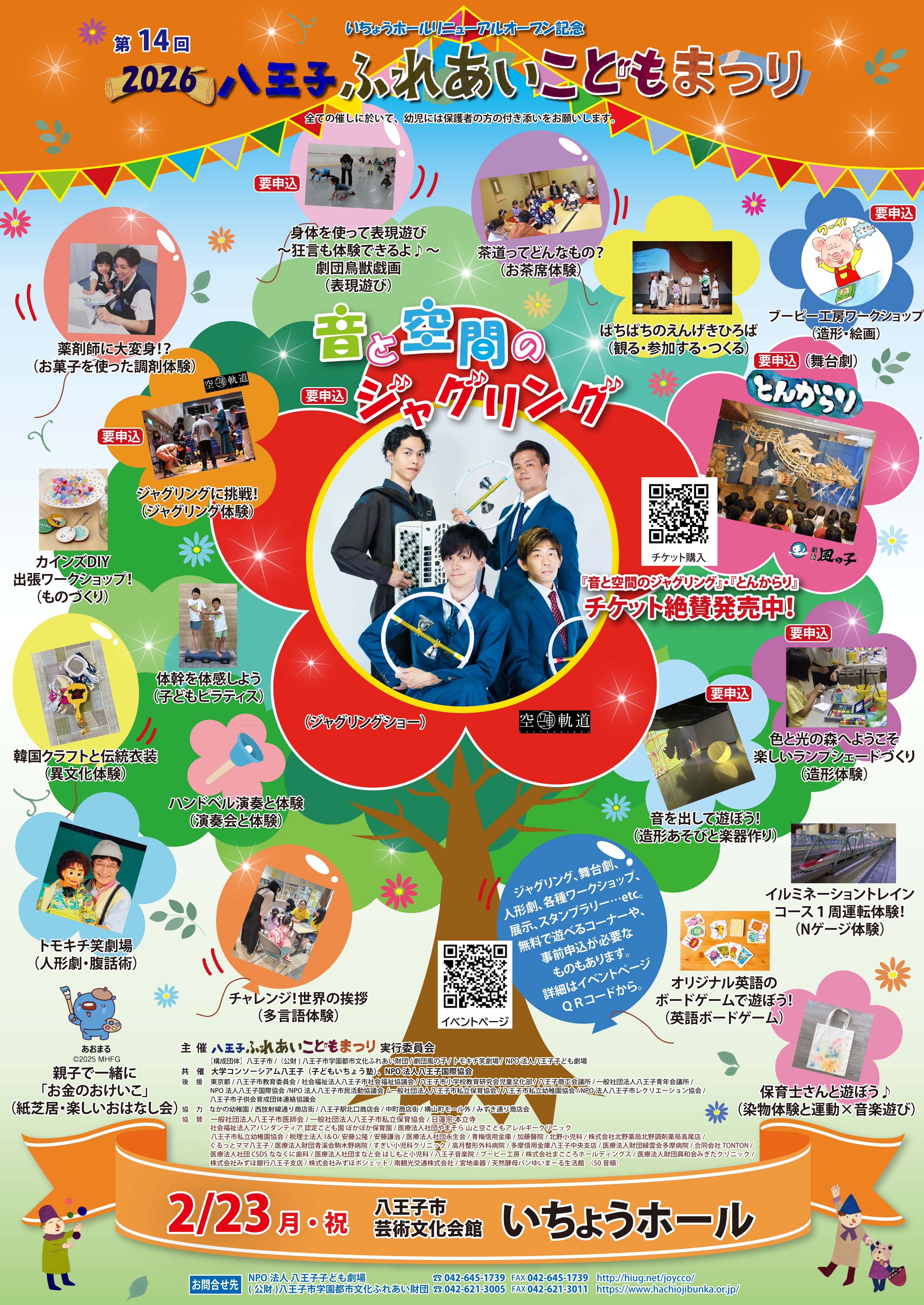 「2026八王子ふれあいこどもまつり」は、「音と空間のジャグリング」や「劇団風の子公演『とんからり』」、子ども向けワークショップ(子育て応援企業、ブービー工房、片倉高等学校茶道部有志、国際協会、市民団体等)、ハンドベル演奏(聖パウロ学園高等学校)、展示など家族で楽しめる様々なイベントが盛りだくさんです。 |